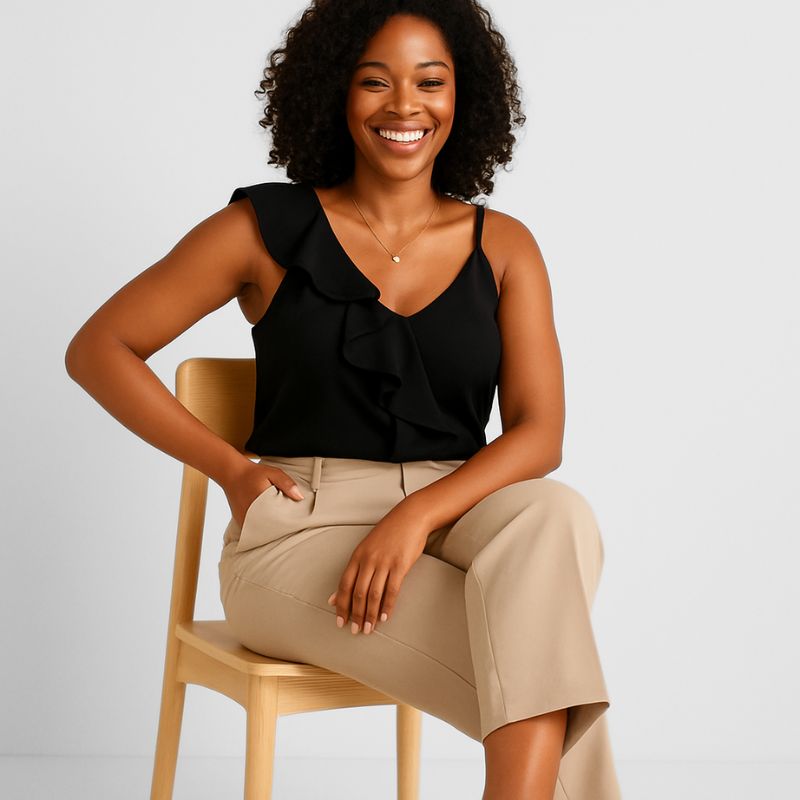 O babado frontal cria movimento e valoriza o colo, enquanto a cor preta traz elegância e facilidade para compor produções do dia à noite.