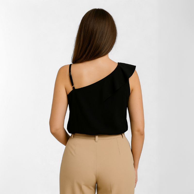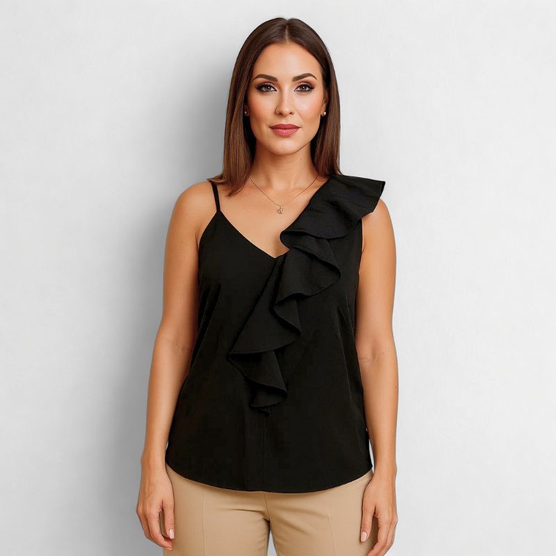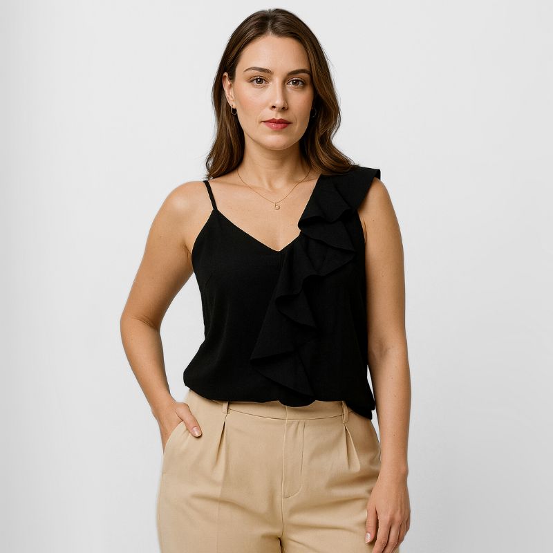 A Regata Feminina Preta Babados Luci é a peça perfeita para quem ama sofisticação com um toque moderno e feminino. Com babado assimétrico e alça fina, ela transforma o básico em um look marcante e versátil para todas as ocasiões.
